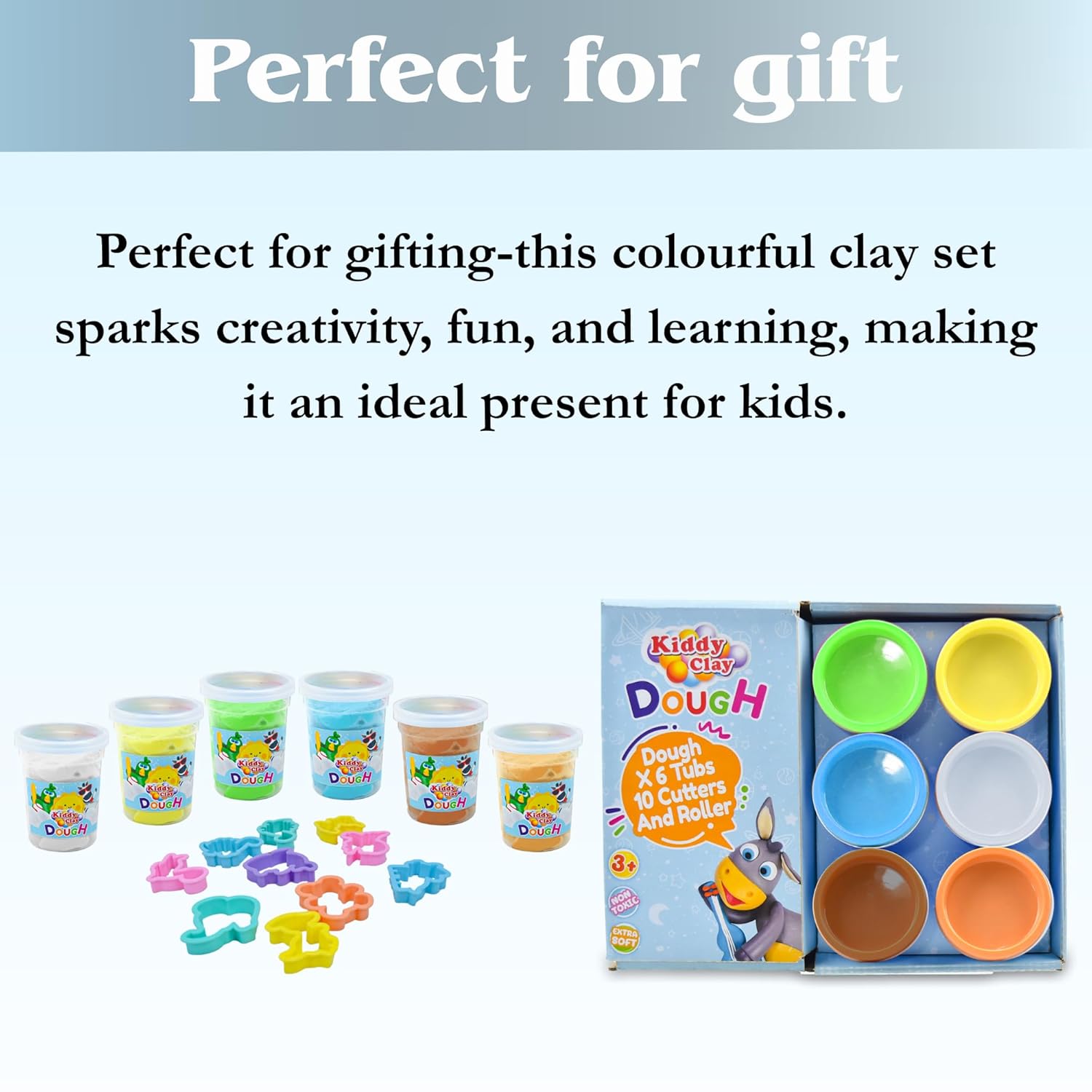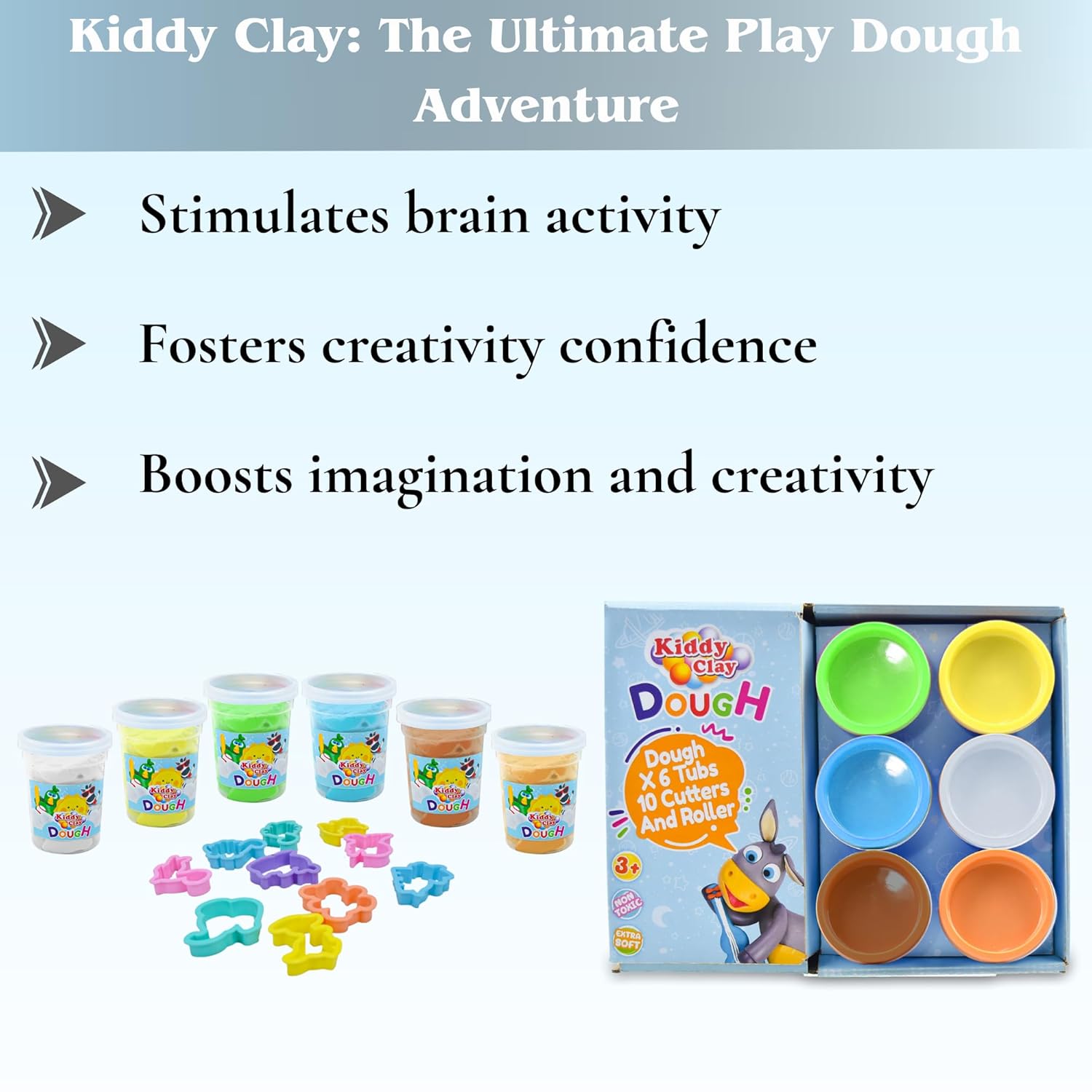 Kiddy Clay 6 Colours Modelling Dough Set – 50g Each – 6 Tubs, 10 Shape Cutters & Roller, Soft, Clay for Creative, Packed in Display Box, Ideal for Arts, Crafts & DIY Projects – 300g