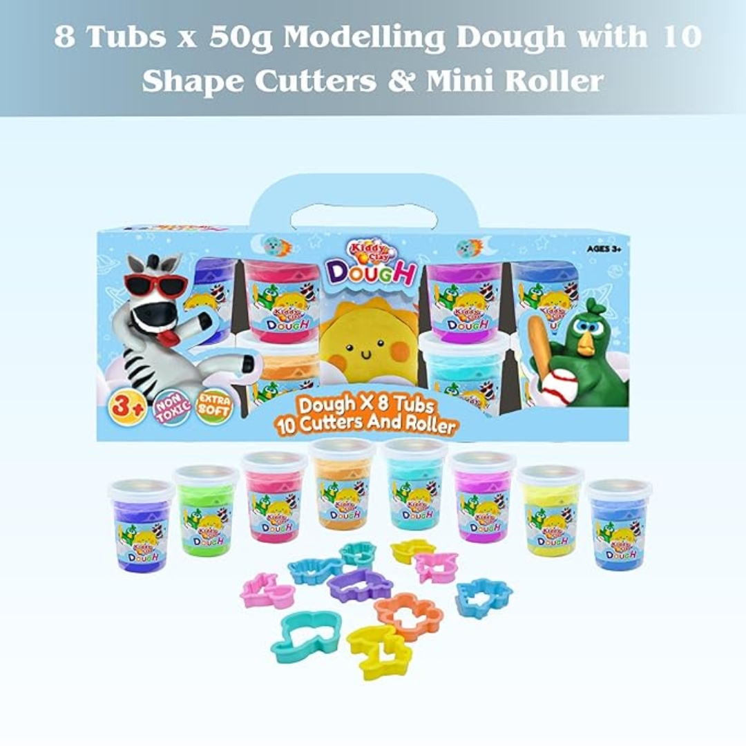 Kiddy Clay 8 Colours Modelling Dough Set – 50g Each – 8 Tubs, 10 Shape Cutters & Mini Roller, Soft, Clay for Creative, Packed in Paper Box, Ideal for Arts, Crafts & DIY Projects – 400g