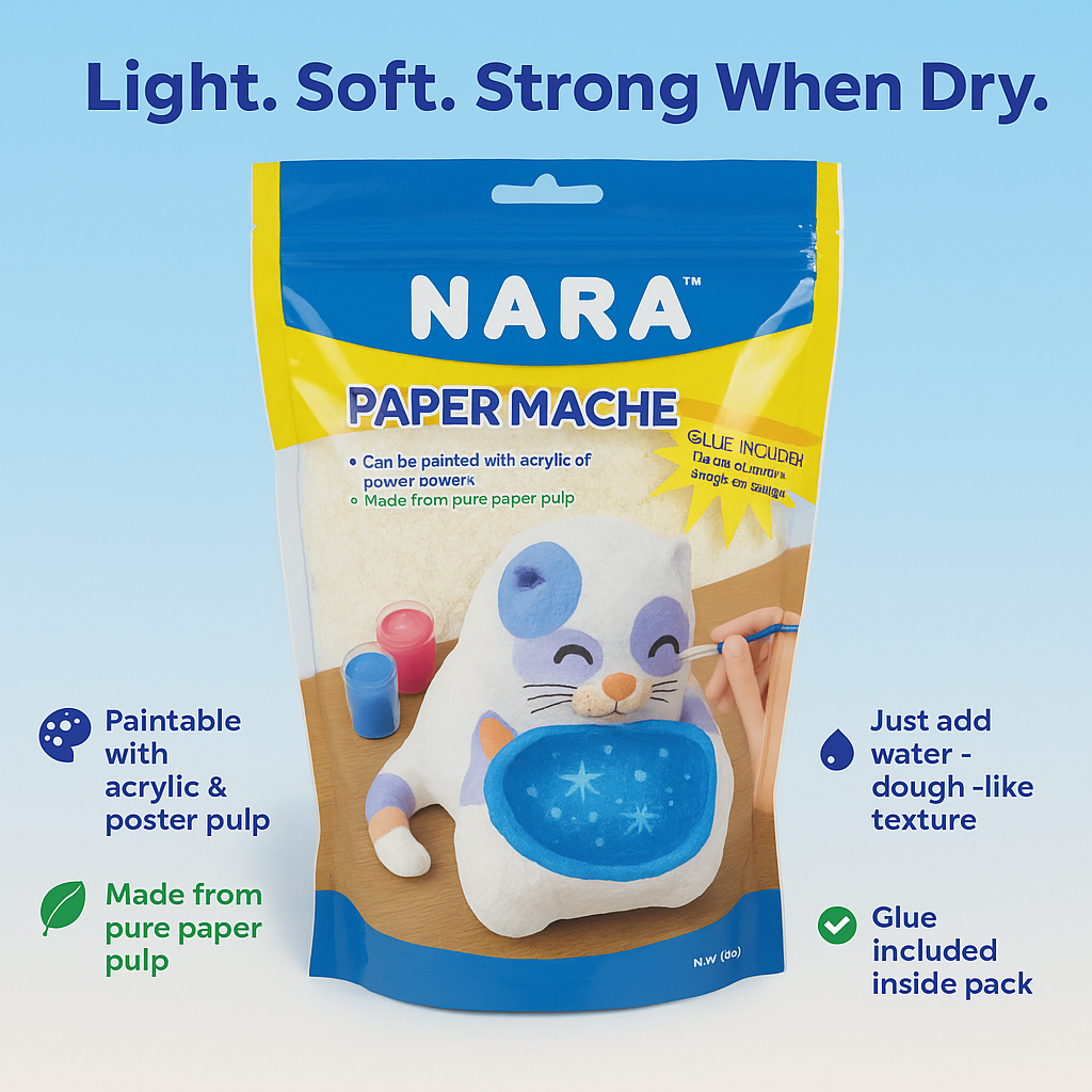 NARA Ready-to-Use Paper Mache Mix makes crafting easy—just add water and start sculpting. Made from pure paper pulp, this extra-soft, lump-free mix is non-toxic, gluten-free, and safe for kids (4+). It air-dries naturally into a lightweight yet durable finish, perfect for painting, sanding, and detailed work. Ideal for toys, masks, models, DIY décor, school projects, and creative learning activities.
